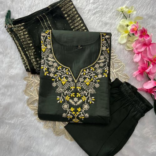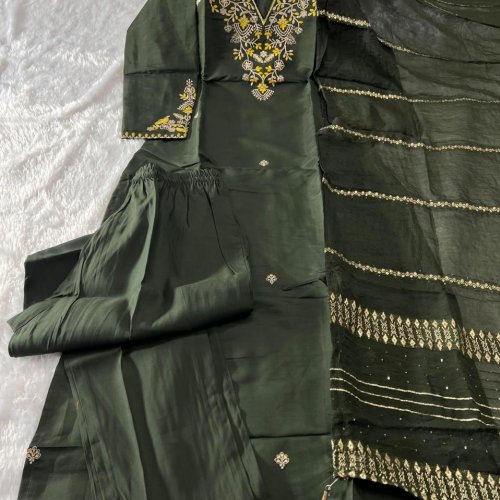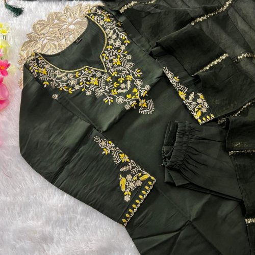 Mehndi Green Roman Silk Ladies Kurti Pant Set